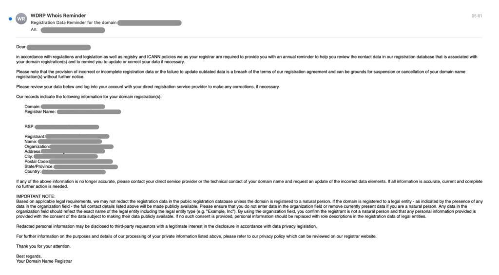 - Betreff: „ACTION REQUIRED – Registrant Verification“ oder „Die Verifizierung Ihrer Domains ist erforderlich“