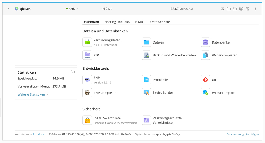 - Wähle die gewünschte Domain aus und wähle den Reiter «Dashboard» aus.