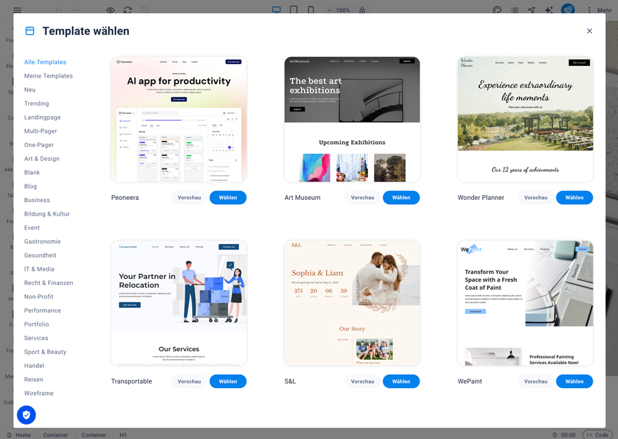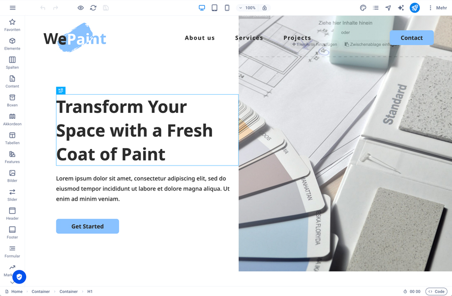 Mit der Auswahl eines Themeplates wird der Editor gestartet und die Musterwebsite mit dem Design angezeigt.