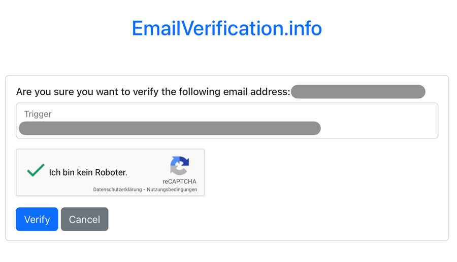 - Klicke auf den Link im E-Mail, du wirst weitergeleitet zur Internetadresse: https://www.emailverification.info/?trigger= …….