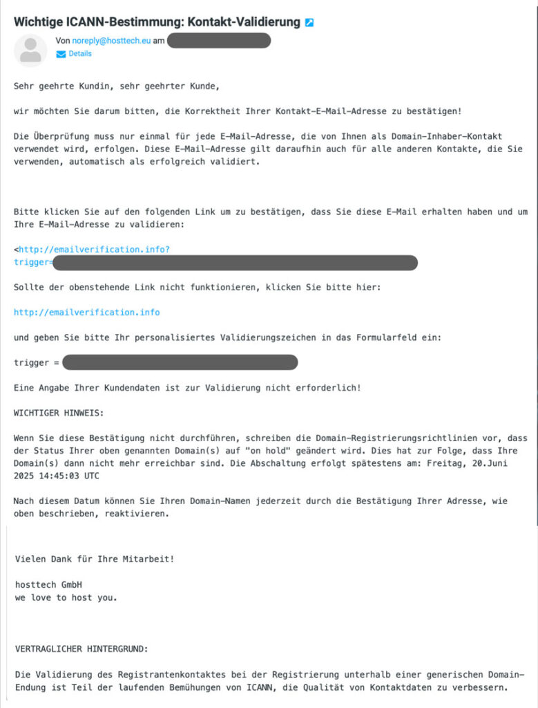 Aufgrund einer neuen Bestimmung der ICANN muss für alle Domaininhaber neu eine bestätigte E-Mail Adresse vorhanden sein. So soll sichergestellt werden, dass der Kontakt jederzeit möglich ist und somit die hinterlegten Kontaktdaten korrekt sind. Die Validierung erfolgt über über eine E-Mail mit einem Link, welcher bestätigt werden muss. Die Nachricht wird versendet von unserem Domain-Partner Hosttech, diese trifft ein von der E-Mail Adresse noreply@hosttech.eu.