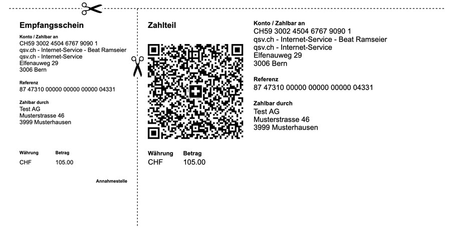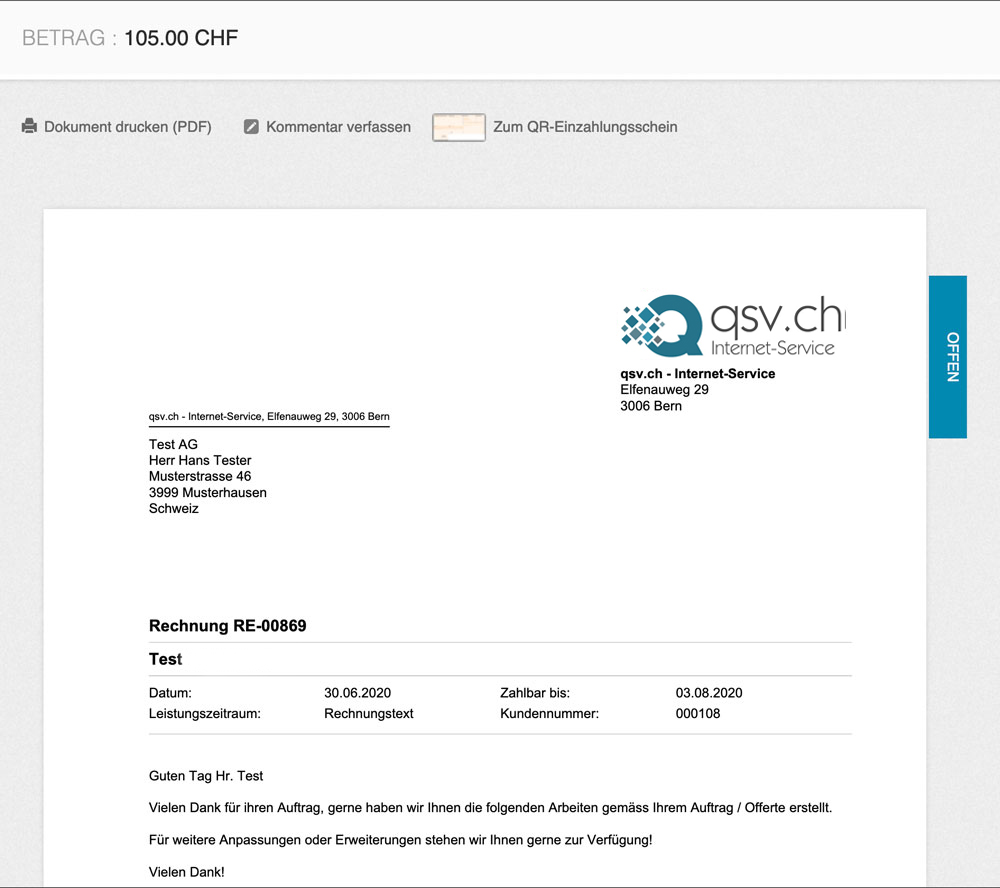 • QR-Einzahlungsschein: Anzeigen des QR-Einzahlungsscheins inkl. QR-Code und lesbare Daten.
